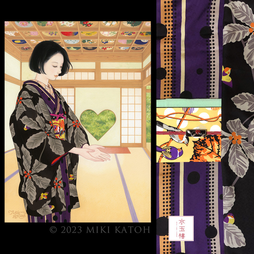 『小鳥と葉着物』『水玉と縞着物』『椿と縞着物』
